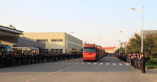 最后,發(fā)貨車輛啟動(dòng),參會(huì)人員列隊(duì)馬路兩邊,歡送滿載成品的車輛啟程。